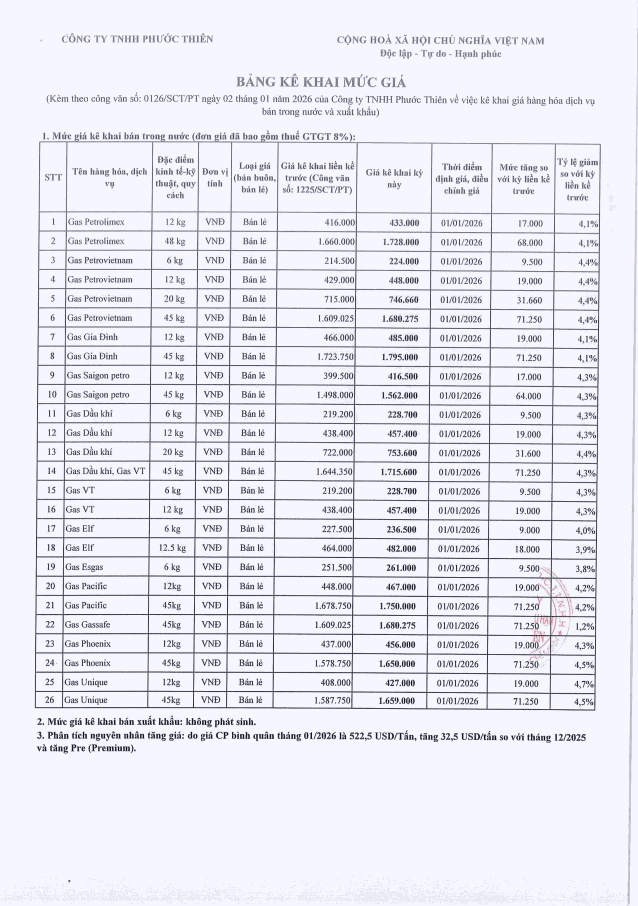 THÔNG BÁO GIÁ GAS BÁN LẺ THÁNG 01/2024